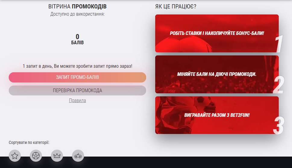 Розділ "Промокоди", який знаходиться під кнопкою "Промо" вартий вашої уваги. Чудова можливість отримати додаткові подарунки у вигляді бонусних балів за щоденну активність, а саме через зроблені ставки та відсоток від залишку на вашому рахунку. Запит на отримання промобалів здійснюється у розділі Промокодів, їх потрібно мати мінімум 100, а також ви можете зробити запит один раз на добу.