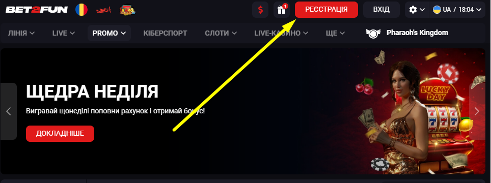Всім гравцям які хочуть вигравати реальні гроші необхідно пройти реєстрацію. Створення облікового запису відбувається швидко та не забирає багато часу. Отже, на головній сторінці BET2FUN, знаходимо відповідну червону кнопку й натискаємо "Зареєструватися".