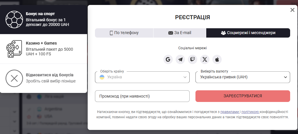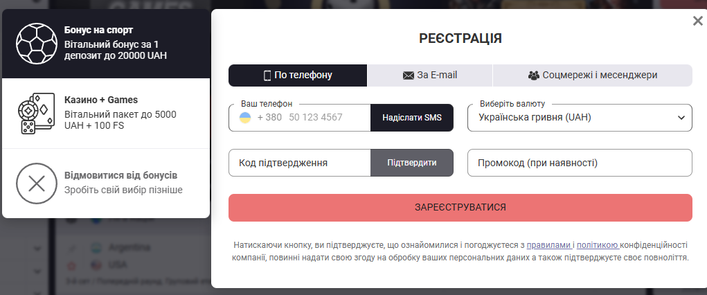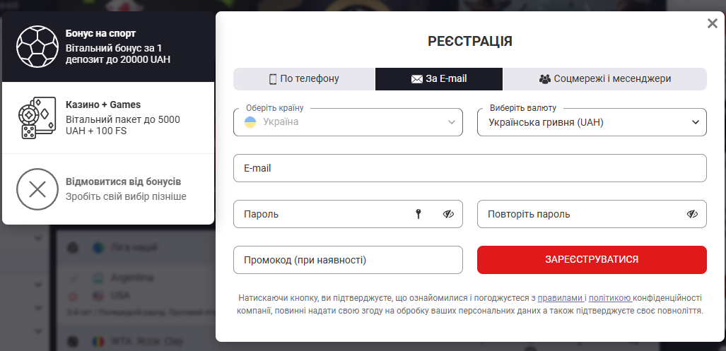 Під час реєстрації на сайті, вам буде запропоновано вибрати, один з двох бонусів (спорт/казино) або опцію відмовитись, а також зручний шлях реєстрації: через мобільний телефон або електронну пошту.